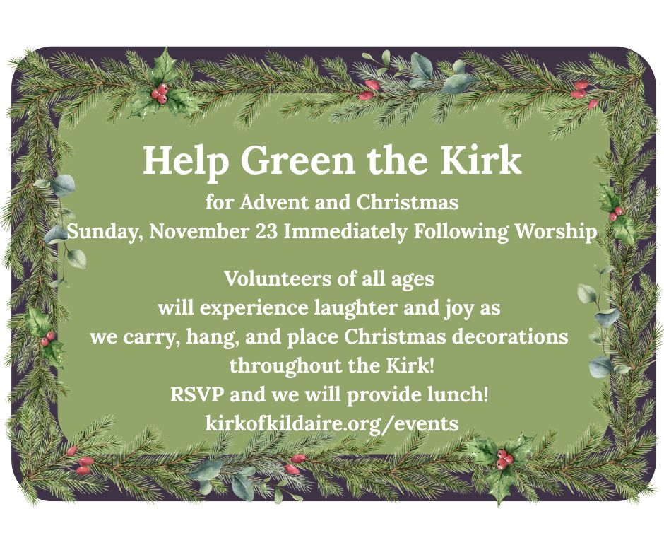 Join us for “greening” the Kirk following worship on Sunday, November 23. Volunteers of all ages will gather for a quick lunch in Fellowship Hall before heading back upstairs to retrieve trees, wreaths, bows and other decorations from their storage spaces to place throughout the building. If you can carry, hang or place something, we can promise you laughter and joy during the quickly passing time.